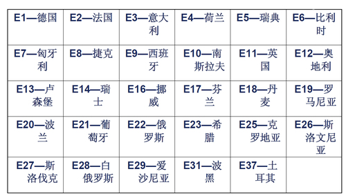 E-Mark 依認證國別不同,所授予之編號也不同。例如向丹麥提出申請,其E-Mark 標志為E18/e18